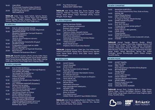 Balıkesir’in kültür ve sanat hayatına katkı sunacak olan 1. Balıkesir Kitap Fuarı 17-26 Ekim tarihleri arasında Avlu Kongre ve Kültür Merkezi’nde ünlü yazarları kitapseverlerle buluşturacak. Balıkesir’de ilk kez düzenlenecek olan kitap fuarının onur konukları Ataol Behramoğlu, Ayşe Kulin ve Prof. Dr. Yılmaz Büyükerşen olacak. 10 gün boyunca 200’ü aşkın edebiyatçı, gazeteci ve akademisyen ile 100’ü aşkın yayınevinin yer alacağı fuarda söyleşiler, imza günleri ve dinletilerle edebiyat tutkunları bilginin ışığında buluşacak.“KUVAYIMİLLİYE DESTANINI DÜNDEN BUGÜNE TAŞIYORUZ”Yıllardır özlemle beklenen kitap fuarını bu yıl ilk defa Balıkesir’e getiren ve yüzlerce ünlü yazarı kitapseverlerle buluşturacak olan Balıkesir Büyükşehir Belediye Başkanı Ahmet Akın, “17-26 Ekim tarihleri arasında Avlu Kongre ve Kültür Merkezi’nde 1. Balıkesir Kitap Fuarı'nı başlatıyoruz. Birbirinden değerli yazarlarımızı, edebiyatçılarımızı ağırlayacağımız fuarımıza tüm hemşehrilerimizi bekliyoruz. Bu fuarı da çok önemsiyoruz. Çünkü kitap aydınlanma ve toplumsal ilerleme demektir. Cumhuriyetimizin kültür ve sanat birikimini daha ileriye taşımak, Balıkesirlileri Gönenli Ömer Seyfettin ile ismi Edremit ile bütünleşen Sabahattin Ali ile buluşturmak, Ulu Önderimiz Gazi Mustafa Kemal Atatürk’ü ve Kuvayımilliye destanını bir kez daha dünden bugüne sağlam adımlarla taşımak için bu fuarı düzenliyoruz.” ifadelerini kullandı.KİTAP TUTKUNLARI BU FUARDA BULUŞACAKAvlu Kongre ve Kültür Merkezi’nde 17-26 Ekim tarihleri arasında her gün 10.00 ila 21.00 saatleri arasında ziyarete açılacak olan fuarın açılış töreni 17 Ekim 2025 Cuma günü saat 18.00’de yapılacak 10 gün sürecek fuarda Ayşe Kulin, Ataol Behramoğlu ve Prof. Dr. Yılmaz Büyükerşen onur konuğu olacak.Aralarında Ahmet Ümit, Ercan Kesal, Sinan Meydan, Nebil Özgentürk, Erol Mütercimler, Nilüfer Açıkalın, Nurullah Genç, Öner Yağcı, Ramazan Kurtoğlu, Haldun Solmaztürk, İlker Başbuğ, Cihat Yaycı, Naim Babüroğlı, Yalçın Karatepe, Zeynep Altıok, Aytunç Erkin, Banu Avar, Can Coşkun, Can Uğur, Cem Özkeskin, Gökmen Karadağ, İrfan Değirmenci, Mehmet Ali Güller, Mustafa Balbay, Murat Ağırel, Necdet Saraç, Sedef Kabaş, Serap Belovacıklı, Serpil Yılmaz, Sinem Fıstıkoğlu, Yavuz Oğhan gibi kamuoyunun yakından tanıdığı birçok yazar ve gazeteci 1. Balıkesir Kitap Fuarı’nda hem kitaplarını imzalayacak hem de farklı konularda söyleşi yapacaklar. Fuarın programı Balıkesir Büyükşehir sosyal medya hesaplarından ve LED ekranlardan takip edilebilecek.1.BALIKESİR KİTAP FUARI'NA KATILACAK KONUKLARBu yıl ilki düzenlenen Balıkesir Kitap Fuarı'nda şu isimler yer alacak; “Abdullah Soykan (Prof.), Adore Yağmur, Ahmet Taşağıl, Ahmet Ümit, Ali Demirsoy (Prof.), Alişan Kapaklıkaya, Almira Taner, Alper Akçam, Anoorshirvan Miandji, Arman Zafer Yalçın (Prof.), Aslan Torun, Aslı Arslan, Ataol Behramoğlu, Aycan Sarıaahmet, Aydın Ayhan, Aylin Torun, Ayşe Kayacan, Ayşe Kulin, Aytuna Yaman, Aytunç Erkin, Aziz Soylu, Banu Avar, Behiç İstanbulluoğlu, Bekir Ahıskalı, Beyhan Budak, Binnur Şafak Nigiz, Burcu Büyükyıldız, Bülent Arısoy, Bülent Demirbilek, Büşra Nur, Can Coşkun, Can Uğur, Canan Kaya, Cem Özkeskin, Cemal Latifoğulları, Cemil Kılıç, Ceren Melek, Cihat Yaycı, Çağdaş Bozkurt, D.N.Archeron, Dilara Keskin, Dilaver Ayyıldız, Dilek Cesur, Dilek Şen, Dilge Güney, Durdu Ergenç, Elif Akpolat, Elif Melissa, Emin Aksoy, Emine Tavuz, Emre Gül, Ercan Kesal, Erol Mütercimler, Ertuğrul Sertbaş, Ethem Duygulu (Prof.), Evrim Şencan, Fatih Murat Arsal, Fatih Tuncay, Fatih Zengin, Fatma Yaşar, Figen Çalıkuşu, Fikret Eroğlu, Filiz Puluç, Gonca Çakır, Gökçen Koçan, Gökmen Karadağ, Gülben Sakar, Gülnur Gündoğan Çizmeci, Haldun Solmaztürk, Halil Genç, Hande Balcan, Hayati İnanç, İlker Başbuğ, İlkgün Demir, İrfan Değirmenci, İsmail Sarıçay, Kader Arvas, Kamil Temizyürek, Kemal Kocabaş (Prof.), Loresima, M. Rise, Maral Atmaca, Mehmet Ali Güller, Mehmet Demirel, Mehmet Tüm, Mehtap Fırat, Melek Koç, Mesut Güler, Mishelov, Miyase İlknur, Murat Ağırel, Mustafa Balbay, Mutlu Tanrıkulu, Müfit Can Saçıntı, Müzeyyen Atvur, Naim Babüroğlu, Nazan Arısoy, Nebil Özgentürk, Necdet Saraç, Necdet Uçan, Nilüfer Açıkalın, Nurullah Genç, Ömer Yetkin, Öner Yağcı, Özgür Nas, Perihan S .Dirican, Ramazan Demir, Ramazan Kurtoğlu, Rıfat Esen, Sabriye Çelik Uğuz (Prof.), Seda Lena, Sedef Kabaş, Sema Oğuz Bey, Senanur Işık, Serap Belovacıklı, Serap Ergün, Serap S. Şen, Serap Yeşiltepe, Sercan Ceylan (Dr.), Serhan Asker, Sertaç Abi, Sibel Uzun, Sinan Meydan, Sinan Yağmur, Şaziye Ekmekçioğlu, Şener Altun, Şener Üşümezsoy (Prof.), Şule Avlanmaz, Şükrü Erbaş, Şükrü Hakan Atalgın, Tacettin Akkuş, Tamer Bolat (Prof.), Tarık Çelenk, Tarık Tufan, Tülay Culha (Prof.), Ümit Özlale (Prof.), Ümit Zileli, Ünal Kar, Yalçın Karatepe (Prof.), Yavuz Oğhan, Yılmaz Büyükerşen (Prof.), Yudum Mingan, Yusuf Akgül, Yusuf Değirmenci, Yüksel Işık, Zeynep Altıok.”