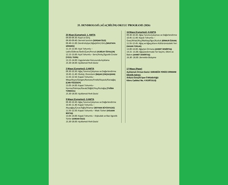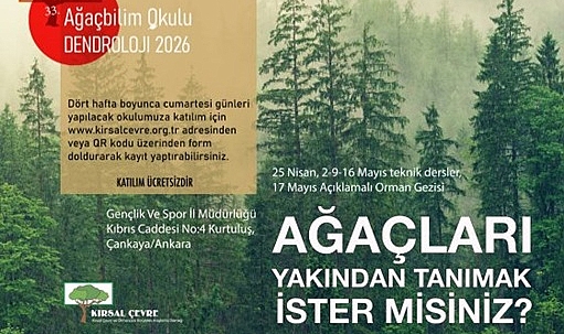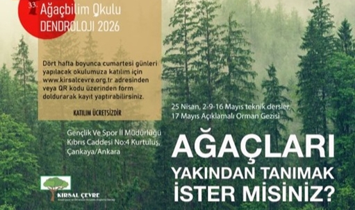 Kırsal Çevre ve Ormancılık Sorunları Araştırma Derneği tarafından bu yıl 33.Dendroloji (Ağaçbilim) Okulumuz 25 Nisan ve 2, 9, 16 Mayıs 2026 tarihlerinde Ankara Gençlik ve Spor İl Müdürlüğünde gerçekleştirilecektir (Cumartesi günleri, toplam 4 hafta).Kontenjanımız salon olanaklarıyla sınırlı olduğu için daha önce hiç katılmamış kişileri kabul edebiliyoruz, anlayışınız için teşekkür ederiz. Dendroloji (Ağaçbilim) Okulumuz her yaştan katılımcıya açık ve ücretsiz bir eğitim programıdır. Belirtilen tarihler arasında her Cumartesi sabahı Ankara Gençlik ve Spor İl Müdürlüğünde iğneli/ibreli ve geniş yapraklı orman ağaçları ile park ve bahçelerde yaygın olarak görülen egzotik ağaçlar üzerine teorik bilgiler vereceğiz. Öğleden sonra ise Ankara parklarında açıklamalı park gezilerimiz olacak. Teorik ve pratik eğitimlerin tamamlanmasının ardından 17 Mayıs 2026 Pazar günü Karabük-Yenice Ormanına bir orman gezisi düzenleyerek 4 hafta boyunca paylaşılan bilgileri tazeleyecek ve eğitimi tamamlayacağız. Eğitim programını aşağıda bulabilirsiniz. Kontenjanımız sınırlı olduğu için 4 haftalık eğitimin en az 3 haftasına katılabileceğini öngören katılımcılarımızın başvurusunu kabul edebileceğiz. Kısıtlı salon olanakları nedeniyle önceliğimiz ilk kez katılanlar ancak daha önce Dendroloji (Ağaçbilim) Okuluna katılmış olanlardan sadece bir kez katılanları yerimiz kaldığı takdirde alabileceğiz.Okulumuzda görüşmek üzere,Kırsal Çevre ve Ormancılık Sorunları Araştırma Derneği Etkinlik Adresi: Ankara Gençlik ve Spor İl Müdürlüğü, Kıbrıs Caddesi No;4 Kurtuluş-AnkaraKırsal Çevre ve Ormancılık Sorunları Araştırma DerneğiBestekar Sokak, ÖZOK Apartmanı, No: 30/8, Kavaklıdere, Çankaya/ANKARATel/Faks: +90 312 425 9414İnternet sayfası: http://www.kirsalcevre.org.tr