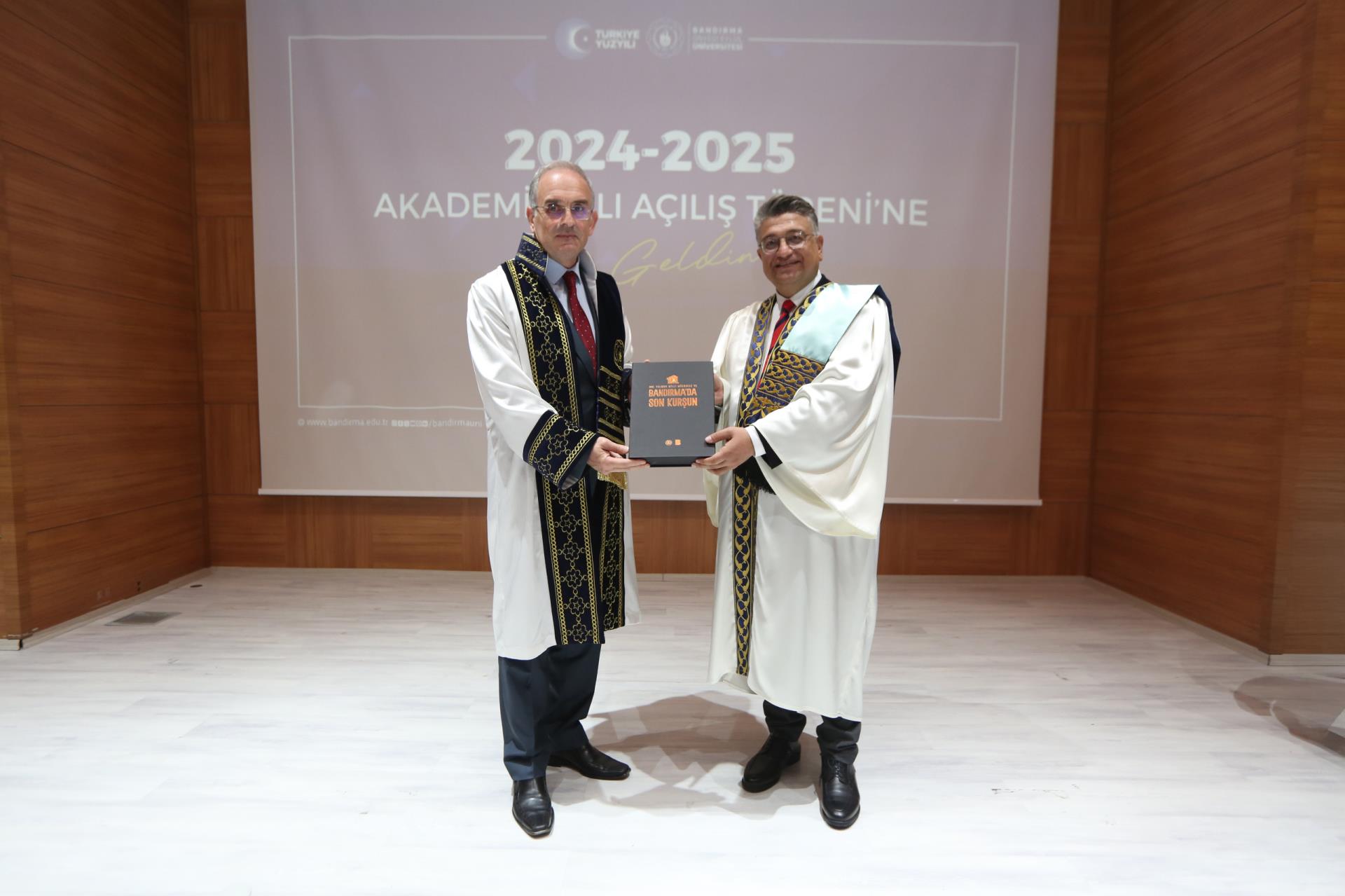 Açılış dersinin ardından Bandırma Onyedi Eylül Üniversitesi Rektörü Prof. Dr. İsmail Boz tarafından Kütahya Dumlupınar Üniversitesi Rektörü Prof. Dr. Süleyman Kızıltoprak’a teşekkür belgesi ve kitap takdim edildi. Yoğun bir katılımla gerçekleşen Bandırma Onyedi Eylül Üniversitesi 2024-2025 Akademik Yılı Açılış Töreni toplu fotoğraf çekimiyle son buldu.