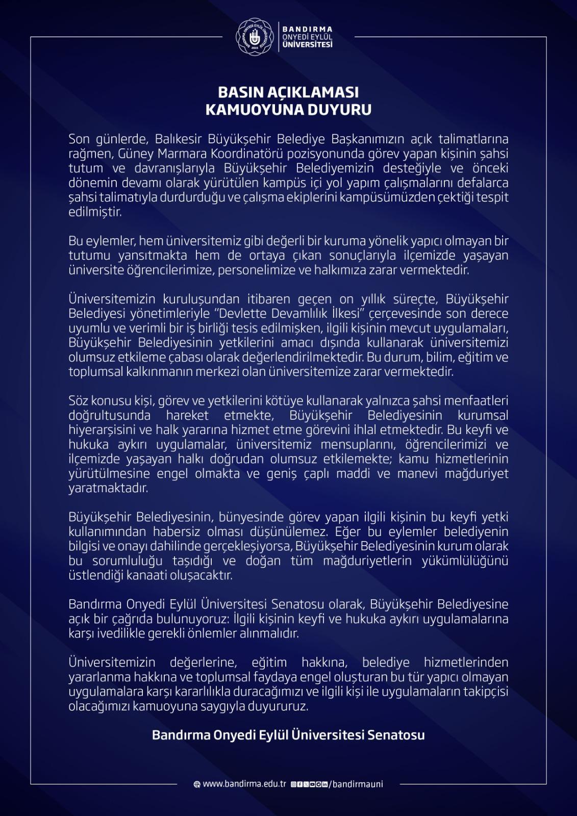 Son günlerde, Balıkesir Büyükşehir Belediye Başkanımızın açık talimatlarına rağmen, Güney Marmara Koordinatörü pozisyonunda görev yapan kişinin şahsi tutum ve davranışlarıyla Büyükşehir Belediyemizin desteğiyle ve önceki dönemin devamı olarak yürütülen kampüs içi yol yapım çalışmalarını defalarca şahsi talimatıyla durdurduğu ve çalışma ekiplerini kampüsümüzden çektiği tespit edilmiştir.