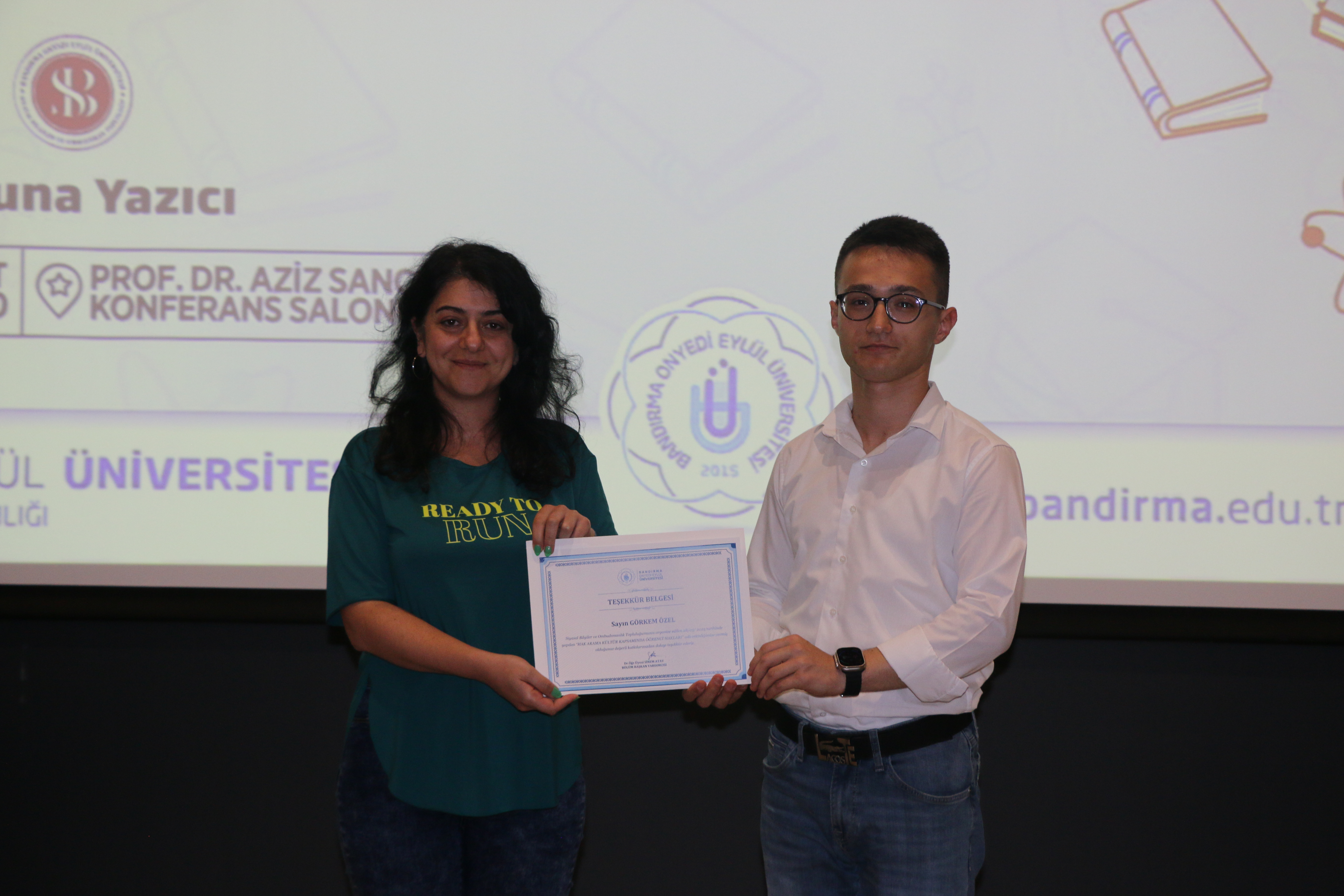 Yazıcı yansı eşliğinde Öğrenci Haklarını ve yasal dayanaklarını anlattı. Görkem Özel’in sorularını cevapladı. Eğitime Prof.Dr. Gökhan Orhan, Dr. Ögr. Üyesi Sinem Atay, Araştırma Görevlisi Bakü Tuna başta olmak üzere akademisyenler, öğrenciler, vatandaşlar katıldı. Eğitim bitiminde teşekkür belgelerini BANÜ İİBF Siyaset Bilimi ve Kamu Yönetimi Bölüm Başkanı Prof.Dr. Gökhan Orhan ve Bölüm Başkan Yard. Dr. Öğretim Üyesi Sinem Atay, Dr. Öğretim Üyesi Baki Tuna Yazıcı ve Görkem Özel’e takdim ettiler.