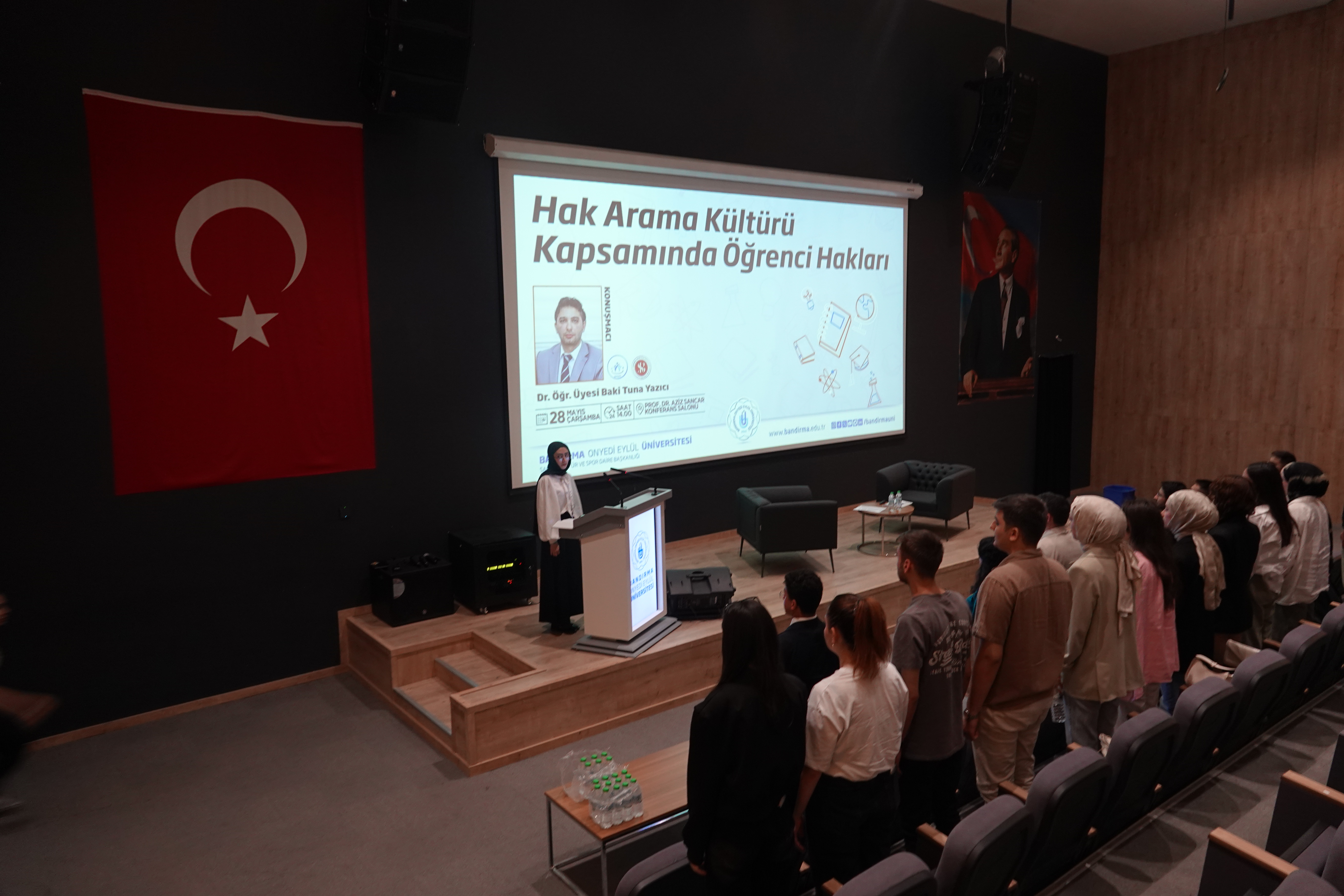 Sonrasında seminer programına geçildi. Siyasal Bilgiler ve Ombudsmanlık Topluluğu üyesi Görkem Özel ve Bandırma Onyedi Eylül Üniversitesi İİBF Dr. Öğretim Üyesi, Hukukçu Baki Tuna Yazıcı sahneye çıkarak eğitime başlandı.