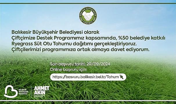 Tarım ve hayvancılığın başkenti Balıkesir’de “Çiftçi Destek Programı” kapsamında; üretimin kaliteli ve verimli bir hale gelmesini sağlayan Büyükşehir Belediyesi, projelerine devam ediyor. Yüzde 50 hibe ile Çiftçi Kayıt Sistemi’ne kayıtlı üreticilere süt otu tohumu (ryegrass) dağıtacak olan Büyükşehir Belediyesi Kırsal Hizmetler Dairesi Başkanlığı, 20 Eylül Cuma gününe kadar https://basvuru.balikesir.bel.tr/Tohum adresinden online olarak talep topluyor. Destek almak isteyen üreticiler bu adresten kayıtlarını oluşturabilecek.