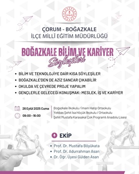"Boğazkale Bilim ve Kariyer Söyleşileri" adıyla 26 Eylül 2025 Cuma günü gerçekleştirilen programda, Yozgat Bozok Üniversitesi Fen Edebiyat Fakültesi Fizik Bölümü’nden Prof. Dr. Mustafa Böyükata, Hitit Üniversitesi Mühendislik ve Doğa Bilimleri Fakültesi Kimya Mühendisliği Bölümü’nden Prof. Dr. Abdurrahman Asan ve Teknik Bilimler Meslek Yüksekokulu İş Sağlığı ve Güvenliği Bölümü’nden Dr. Öğr. Üyesi Gülden Asan, bir araya geldikleri öğrencilerle "Bilim ve Teknolojiye Dair Kısa Söyleşiler", "Boğazkale'den de Aziz Sancar çıkabilir", "Okulda ve Çevrede Proje Yapalım" ve "Gençlerle Geleceği Konuşmak: Meslek, İş ve Kariyer" vurgulu konular etrafında bilgiler paylaştılar.