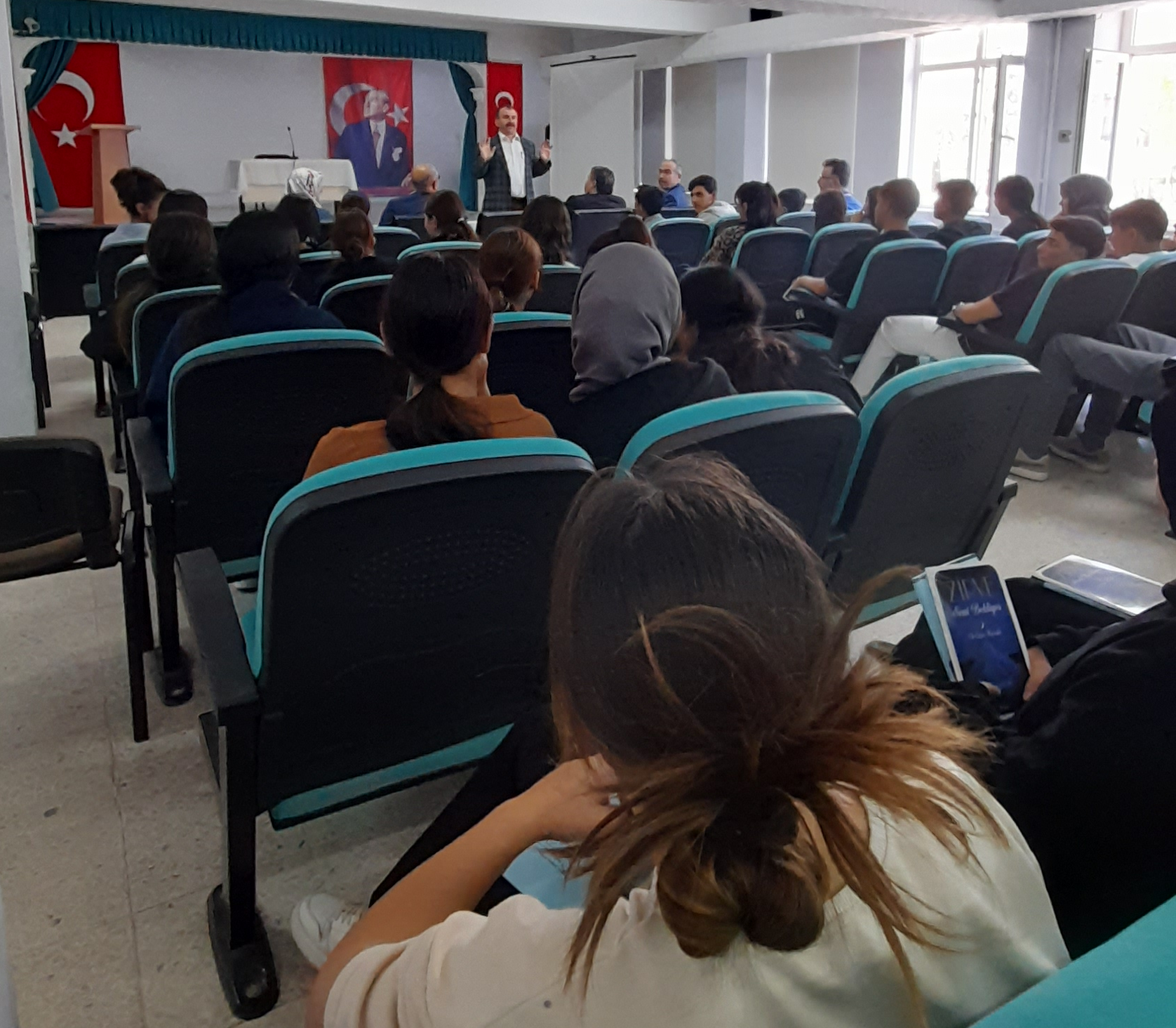Liseli gençlerle okullarının konferans salonunda bir araya gelen akademisyenler yol gösterici bilgiler paylaştı. Prof. Dr. Mustafa Böyükata, "Gençlerle Geleceği Konuşmak: Meslek, İş ve Kariyer" başlığı etrafında verdiği bilgilerde adeta beyin fırtınası yaptırdı. Bugünkü bilimsel gelişmelerin antik dönemlerdeki bilimsel düşünceye, daha sonraki dönemlerde üretilen salt bilimsel bilgiye ve hem deneysel hem teorik ve hem de hesaplamalı bilimlerdeki ilerlemelere bağlı oluşuna dair örnekler verdi. Meslek, iş ve kariyer gibi kavramların farklılıklarını izah etti.