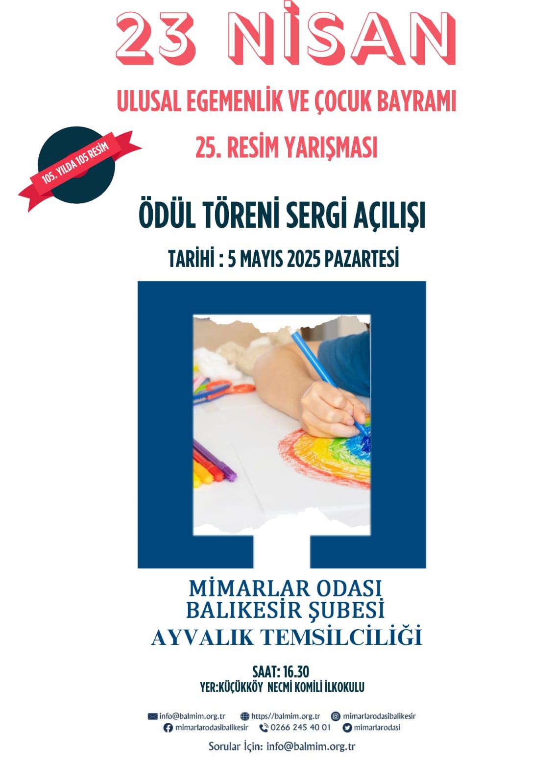 23 Nisan Ulusal Egemenlik ve Çocuk Bayramı Çerçevesinde Mimarlar Odası Balıkesir Şubesi olarak düzenlemekte olduğumuz 23 Nisan Resim Yarışmasının bu yıl 25.incisini gerçekleştirdik. Balıkesir İl Genelinde İlk ve Ortaokul Öğrencileri arasında yapılan resim yarışmamıza toplam 454 öğrenci katılmıştır. #105Yılda105Resim başlığındaki 25. Resim Yarışmamızın ödül töreni ve sergisi 26 Nisan 2025 tarihinde Balıkesir Merkezde, 30 Nisan 2025 tarihinde Manyas'da ve 5 Mayıs 2025 tarihinde Ayvalık’ta olmak üzere 3 ayrı yerde gerçekleşmiştir. Yarışmada 56 öğrenci ödül almıştır. Altıeylül, Ayvalık, Balya, Bandırma, Bigadiç, Burhaniye, Dursunbey, Edremit, Havran, İvrindi, Karesi, Manyas ve Susurluk ilçelerinden resim yarışmasına katılan tüm öğrencilerimize de teşekkür belgeleri verilmiştir.
