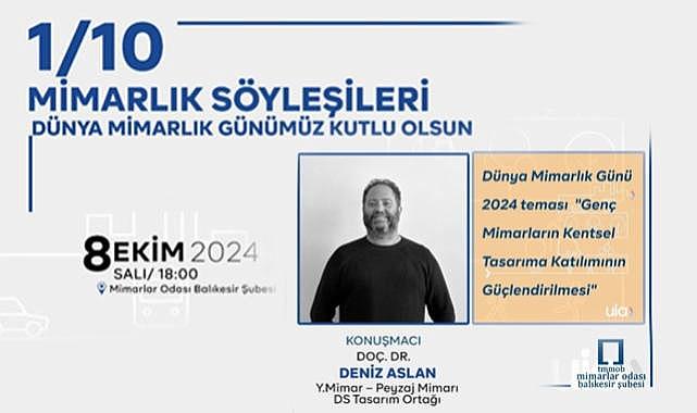 İlk etkinlik 8 Ekim Salı 2024 Günü saat 18.00’de Mimarlar Odası Balıkesir Şubesinde Y.Mimar ve Peyzaj Mimarı Doç.Dr. Deniz Aslan Dünya Mimarlık Günü 2024 teması olan “ Genç Mimarların Kentsel Tasarıma Katılımının Güçlenmesi” başlığı ile söyleşi yapacaktır.