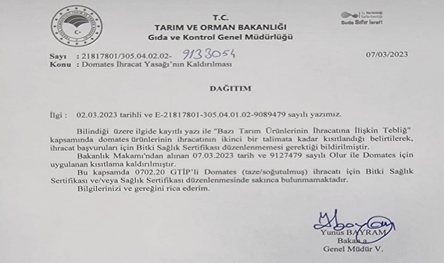 Tarım ve Orman Bakanlığı gelen tepkiler üzerine domateste ki ihracat yasağını kaldırarak, Gıda ve Kontrol Genel Müdürlüğü’nün 07.03.2023 tarih ve 21817801/305.04.02.02-9133054 sayılı yazısı ile ilgili kurum ve kişilere bildirdi.