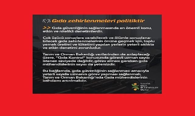 Gıda güvenliğinin sağlanmasında en önemli konu, etkin ve nitelikli denetimlerdir. Çok üzücü sonuçlara varabilecek ve ölümle sonuçlanabilecek gıda zehirlenmelerinin önüne geçmek için, toplu yemek üretimi ve tüketimi yapılan yerlerin yeterli sıklıkta ve etkin denetimi zorunludur. Tarım ve Orman Bakanlığı verilerinden de anlaşılacağı üzere, “Gıda Kontrol” konusunda görevli uzman sayısı istenen seviyede değildir, görev alması gereken gıda mühendislerinin sayısı da yetersizdir. Bu bağlamda, gıda güvenliğinin sağlanması amacıyla yeterli sayıda uzmanın görev yapması sağlanmalı, Tarım ve Orman Bakanlığı’nda Gıda mühendislerinin istihdamı artırılmalıdır.