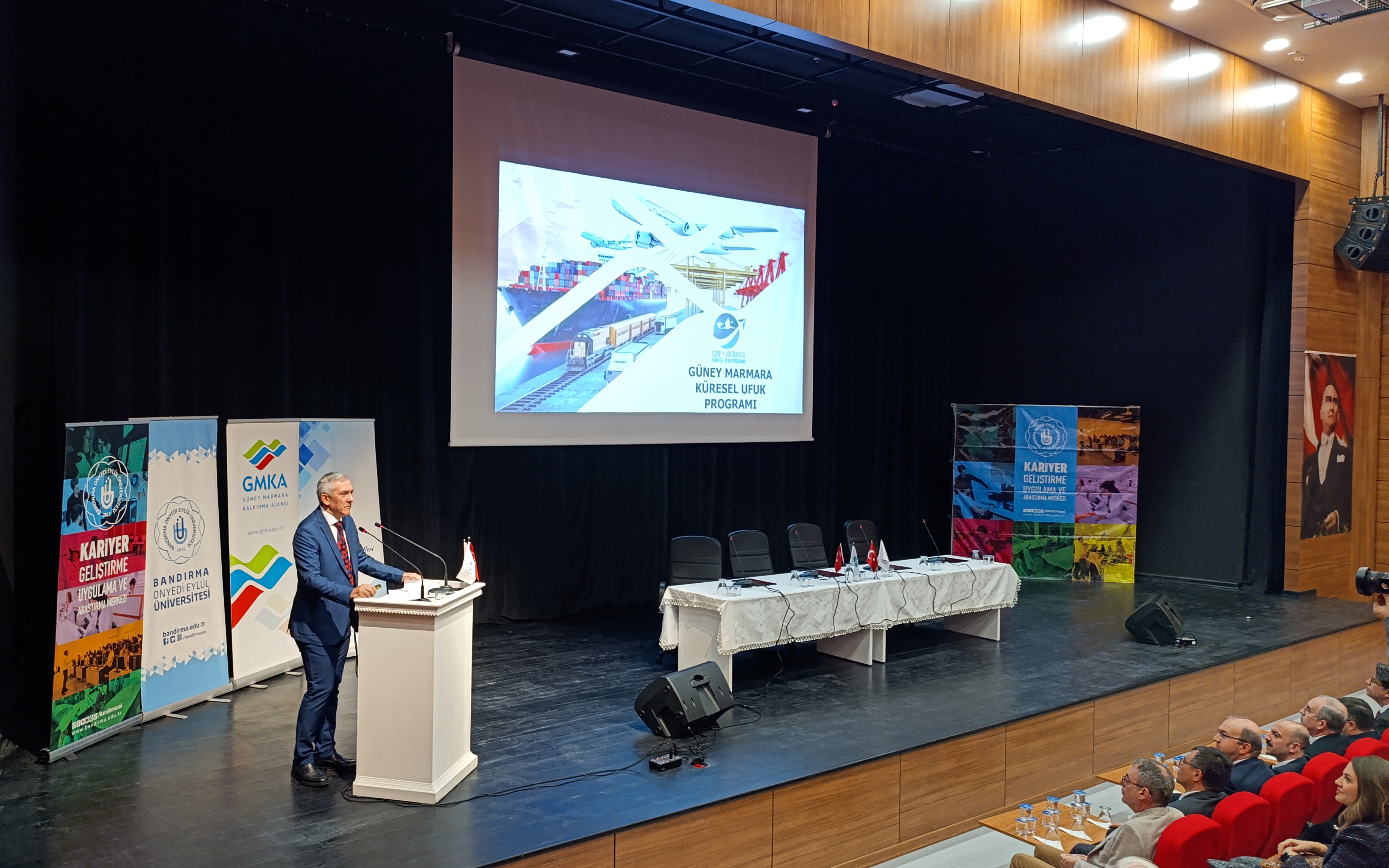 Program, protokol konuşmalarının ardından Projenin akademik ve sektörel boyutunun detaylandırıldığı uzman sunumları ile devam etti. Programın ilk sunumu GMKA Uzmanı Candan Şahin tarafından gerçekleştirildi. GMKA’nın misyon, vizyon ve hedefleri bağlamında Güney Marmara Küresel Ufuk Programı’nı değerlendiren GMKA Uzmanı Candan Şahin, programa dair yapılan fizibilite çalışmaları hakkında detaylı bilgiler paylaştı. Ardından kürsüye çıkan BANÜ Kariyer Geliştirme Uygulama ve Araştırma Merkezi (BANÜ-KAGEM) Müdürü Doç. Dr. Armağan Türk gerçekleş-tirdiği sunumda, Güney Marmara Küresel Ufuk Programı’nın kilometre taşlarından, programa katılan öğrencilere verilen mentorluk eğitimlerinden ve programın bölgeye sağlayacağı ekonomik katkıdan bahsetti.