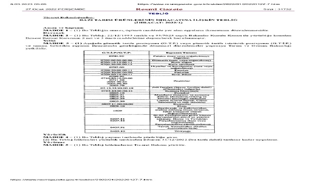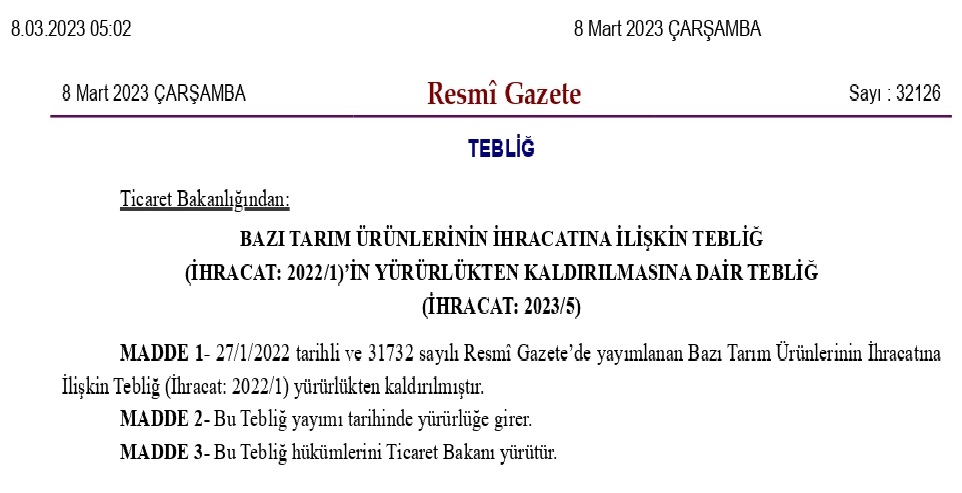 Bazı Tarım Ürünlerinin İhracatına İlişkin Tebliğ (İHRACAT: 2022/1)’in Yürürlükten Kaldırılmasına Dair Tebliğ (İHRACAT:2023/5) 8 Mart 2023 tarih ve 3216 sayılı Resmi Gazetede yayınlanarak yürürlüğe girmiştir.