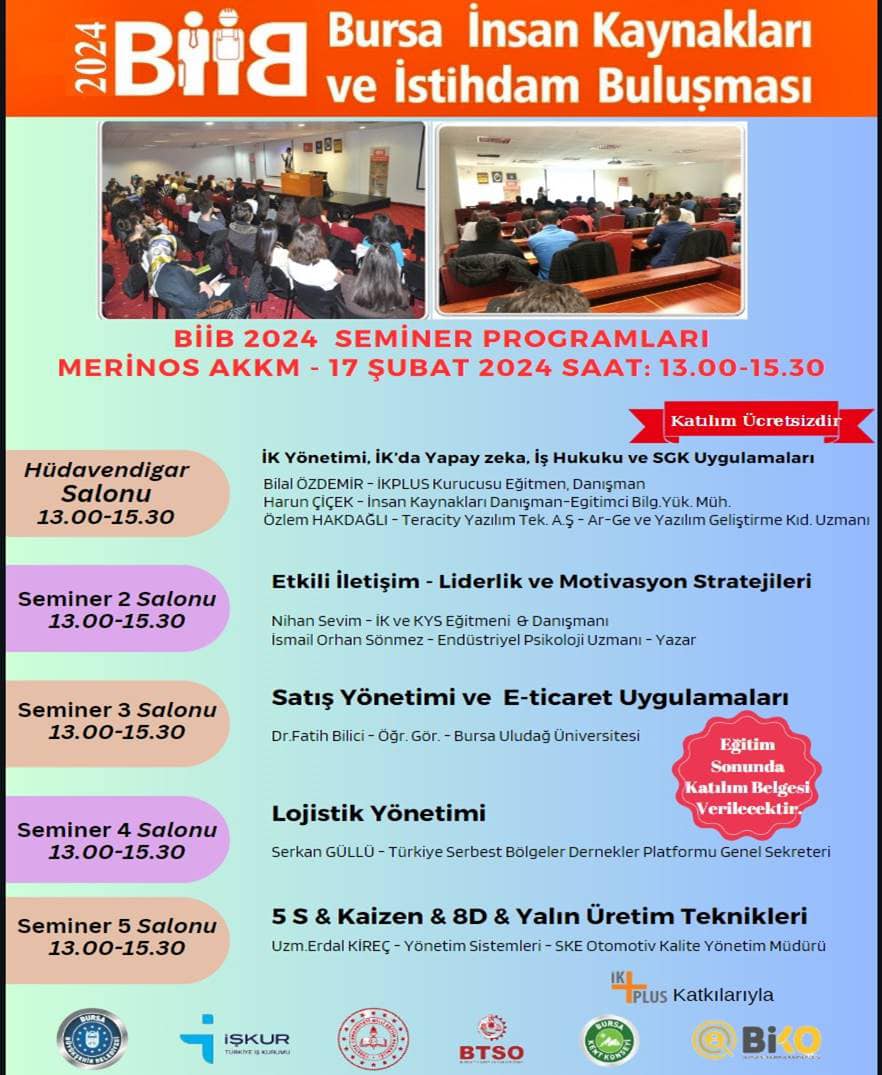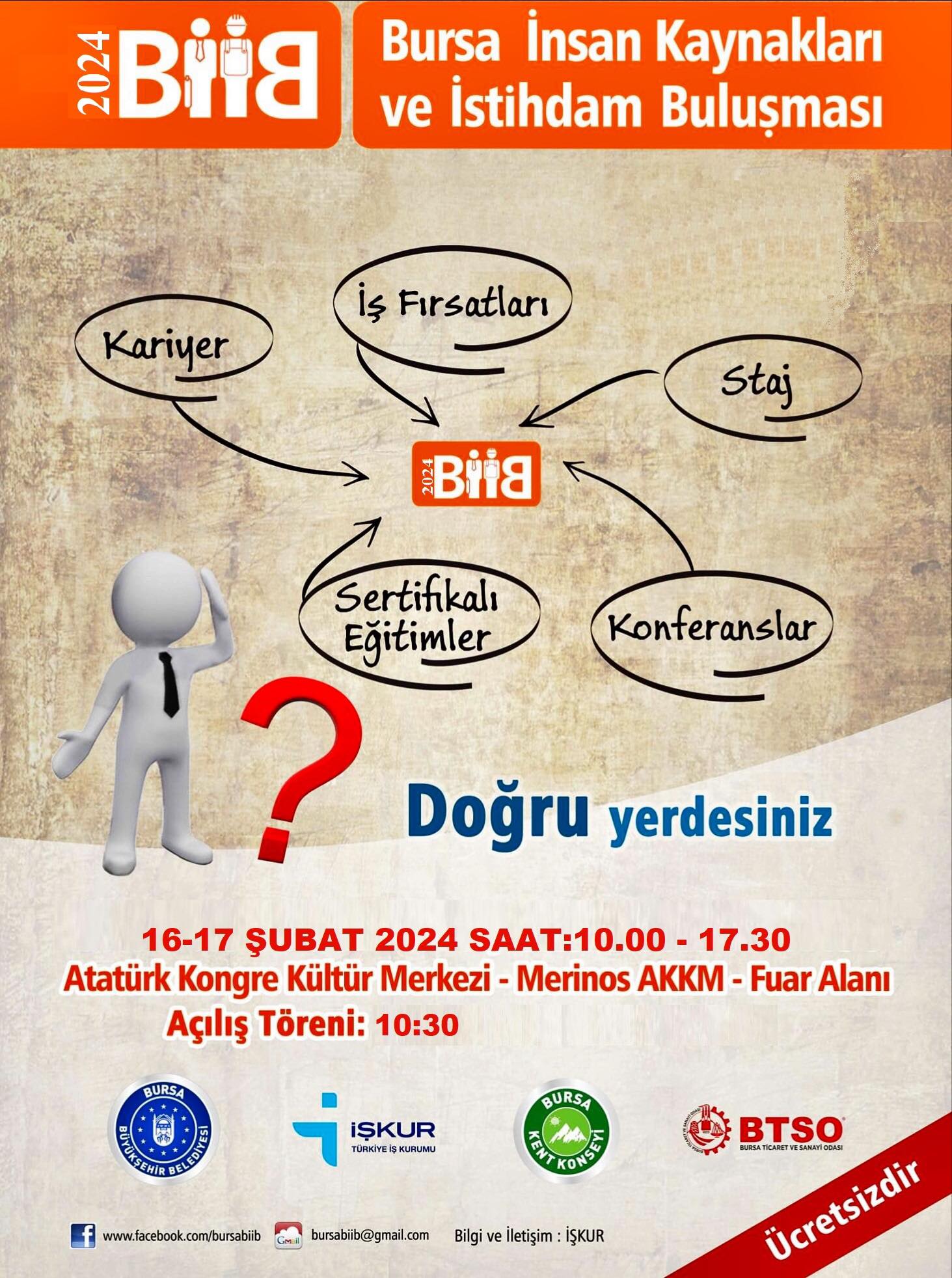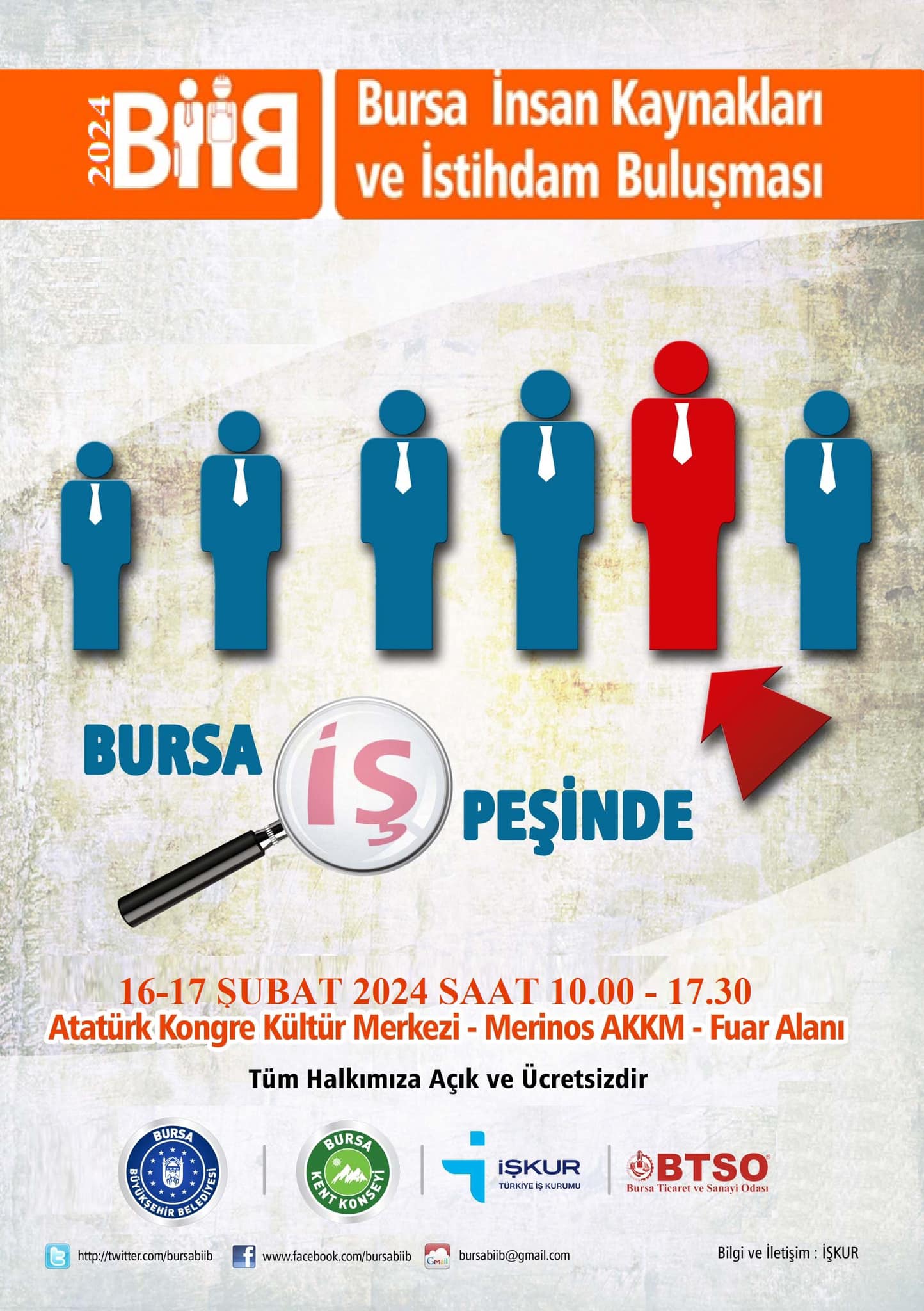 Bursa Büyükşehir Belediyesi, Çalışma ve İş Kurumu İl Müdürlüğü, İl Milli Eğitim Müdürlüğü, Bursa Ticaret ve Sanayi Odası (BTSO), Bursa Kent Konseyi (BKK) ve Bursa İstihdam ve Kariyer Ofisi (BİKO) tarafından düzenlenen Bursa İnsan Kaynakları ve İstihdam Buluşması, bu yıl da iş arayanlarla işverenlerini bir araya getirecek. İnsan kaynakları ve istihdam alanında Türkiye’nin en kapsamlı organizasyonlarından biri olan etkinlik 274 firma, binlerce katılımcı ile sektörün ihtiyaç duyduğu insan kaynağını firmalarla buluşturacak. Ahmet Şerif İzgören’in 16 Şubat 2024 Cuma günü 15.00’da konuşmacı olacağı fuarda, 17 Şubat Cumartesi günü de pek çok seminer gerçekleştirilecektir.