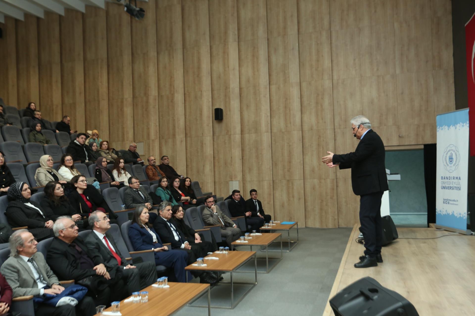 Prof. Dr. Aziz Sancar Konferans Salonu’nda düzenlenen konferansa; BANÜ Rektörü Prof. Dr. İsmail Boz, Rektör Yardımcıları Prof. Dr. Alpaslan Serel ile Prof. Dr. Ebru Kaya Mutlu, Genel Sekreter Cihangir Boz, akademisyenler ve basın mensupları katılım sağladı.
