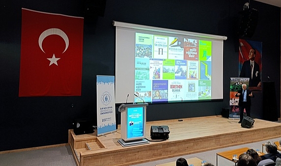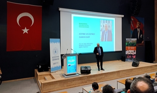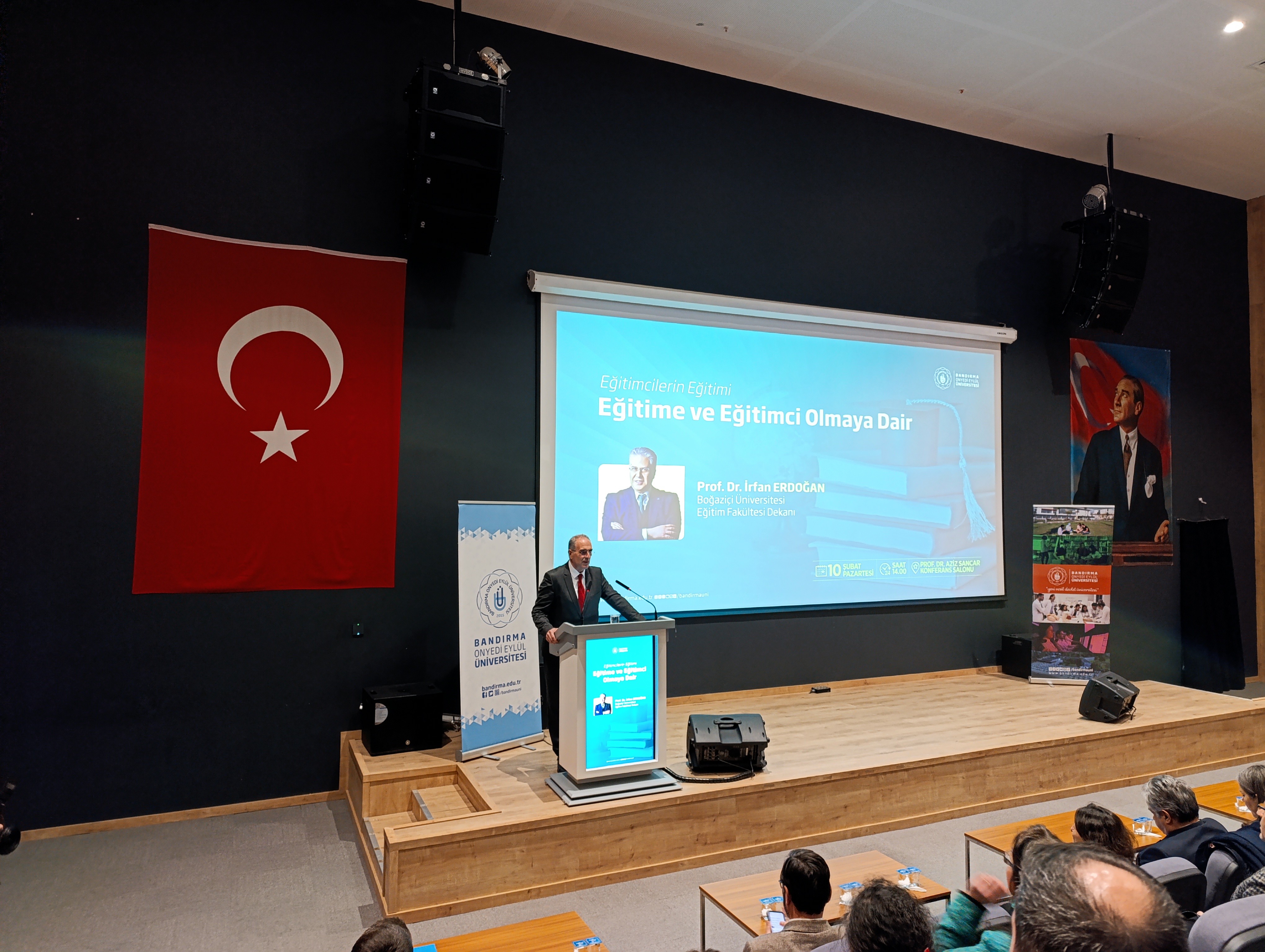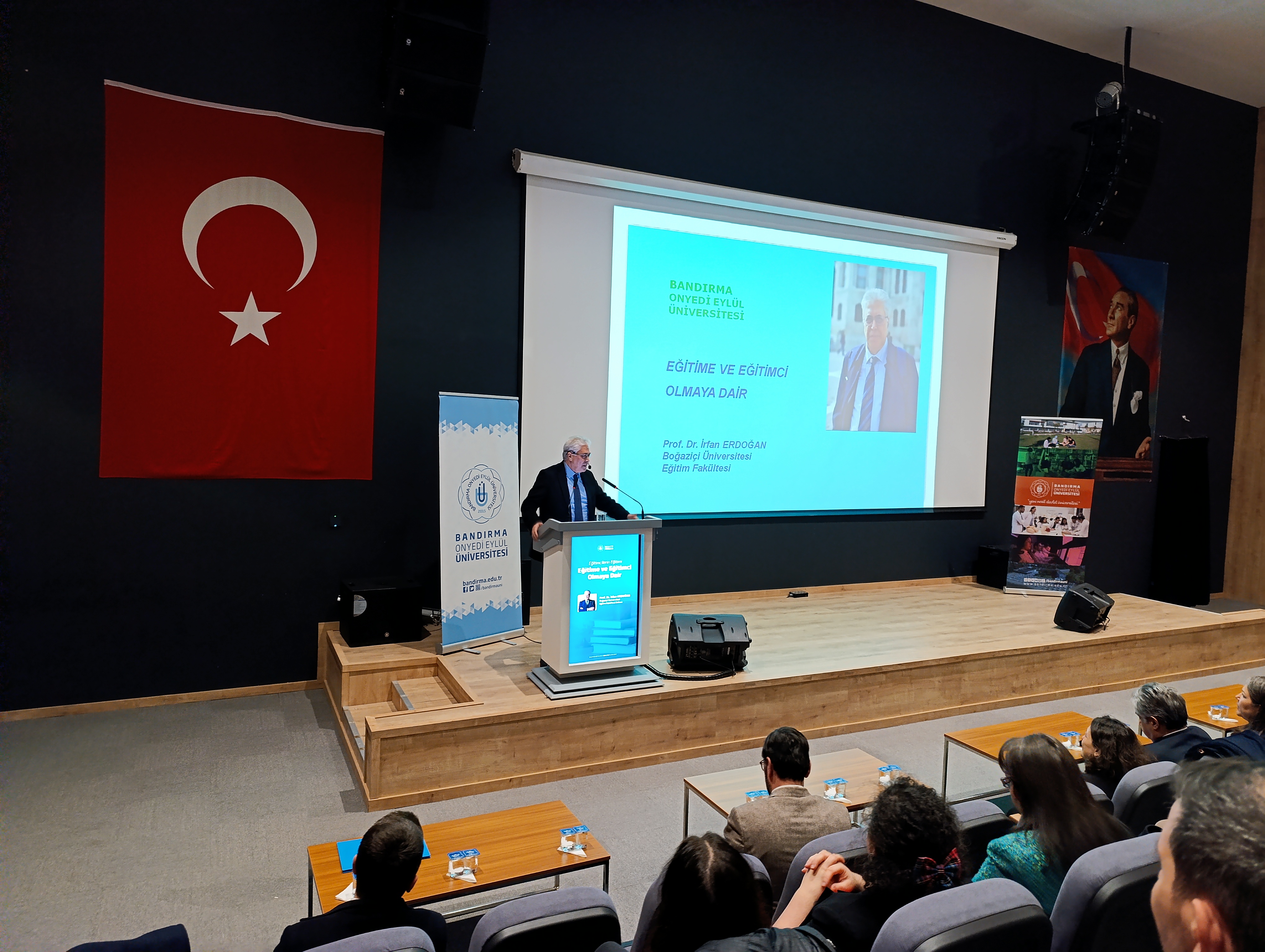 Eğitim hayatının bir bölümünü Bandırma Şehit Süleyman Bey Ortaokulu’nda geçiren Prof. Dr. İrfan Erdoğan, sözlerine Bandırma ile ilgili anılarını anlatarak başladı. Eğitim alanında yazılan eserlerden ve bu alanda çalışma yapan yazarların hayatlarından kesitler sunan Prof. Dr. İrfan Erdoğan, ebeveynlerin çocuklarına başarılı insanların biyografilerini okutmayı önermesini tavsiye etti. Kendi tecrübelerinden ve okuduklarından yola çıkarak yaptığı bir çıkarım sonucu “Öğrenci olmanın püf noktalarını çözen bireyler çok iyi bir öğretmen olabilir.” ifadelerini kullanan Prof. Dr. İrfan Erdoğan, “Öğretmen ilkokulda da üniversitede de filozof gibi davranış sergilemelidir. Filozofluk ise size ait bir şeydir; paket halinde verilen bir olgu değildir” ifadelerinin altını çizdi. Geçmişteki eğitim sistemini toptan övmenin ya da yermenin hata olacağını belirten Prof. Dr. İrfan Erdoğan, eğitim hayatının en önemli materyali olan kitapların müfredatın ötesinde icraat içermesi gerektiğini vurguladı.