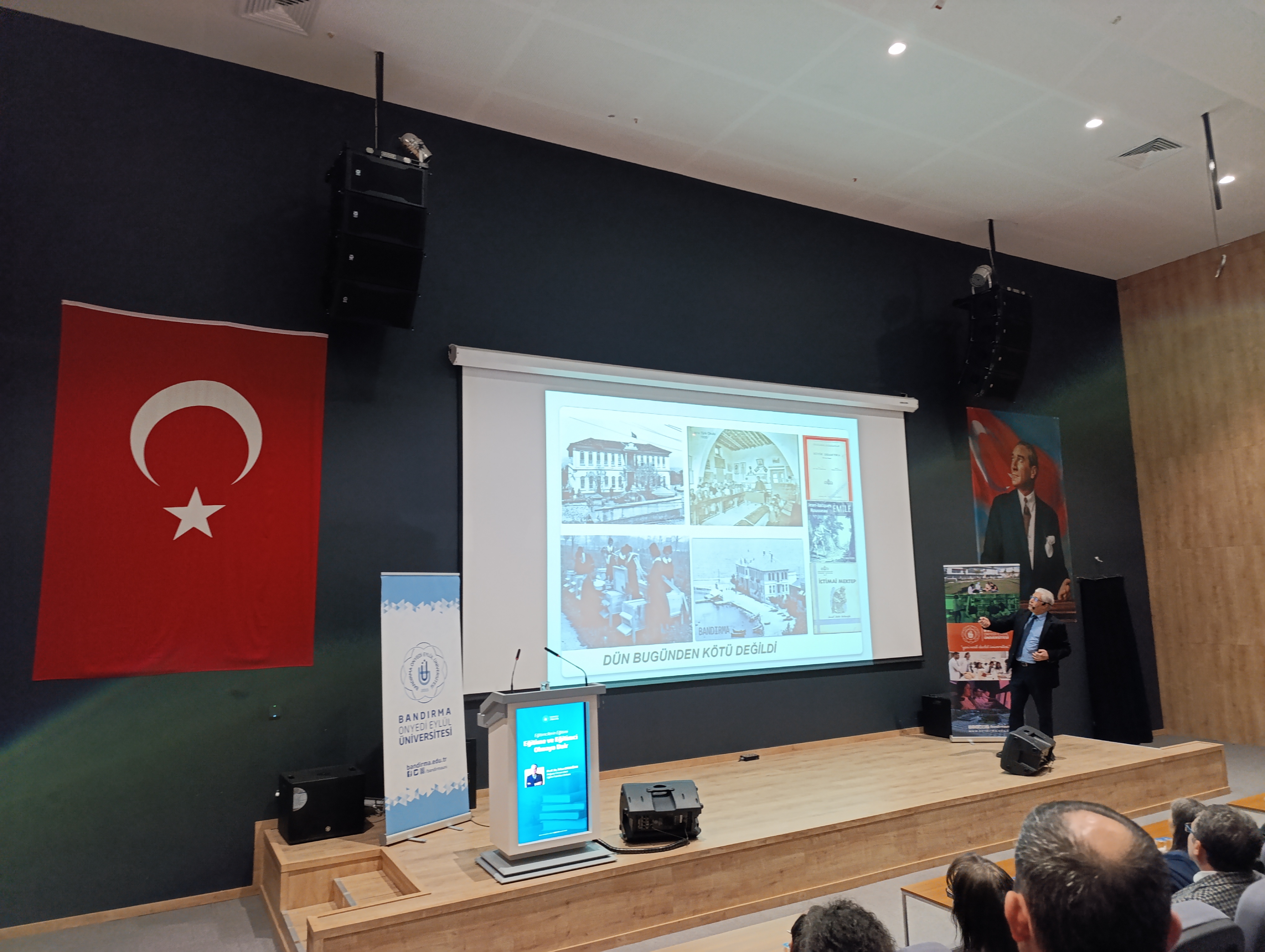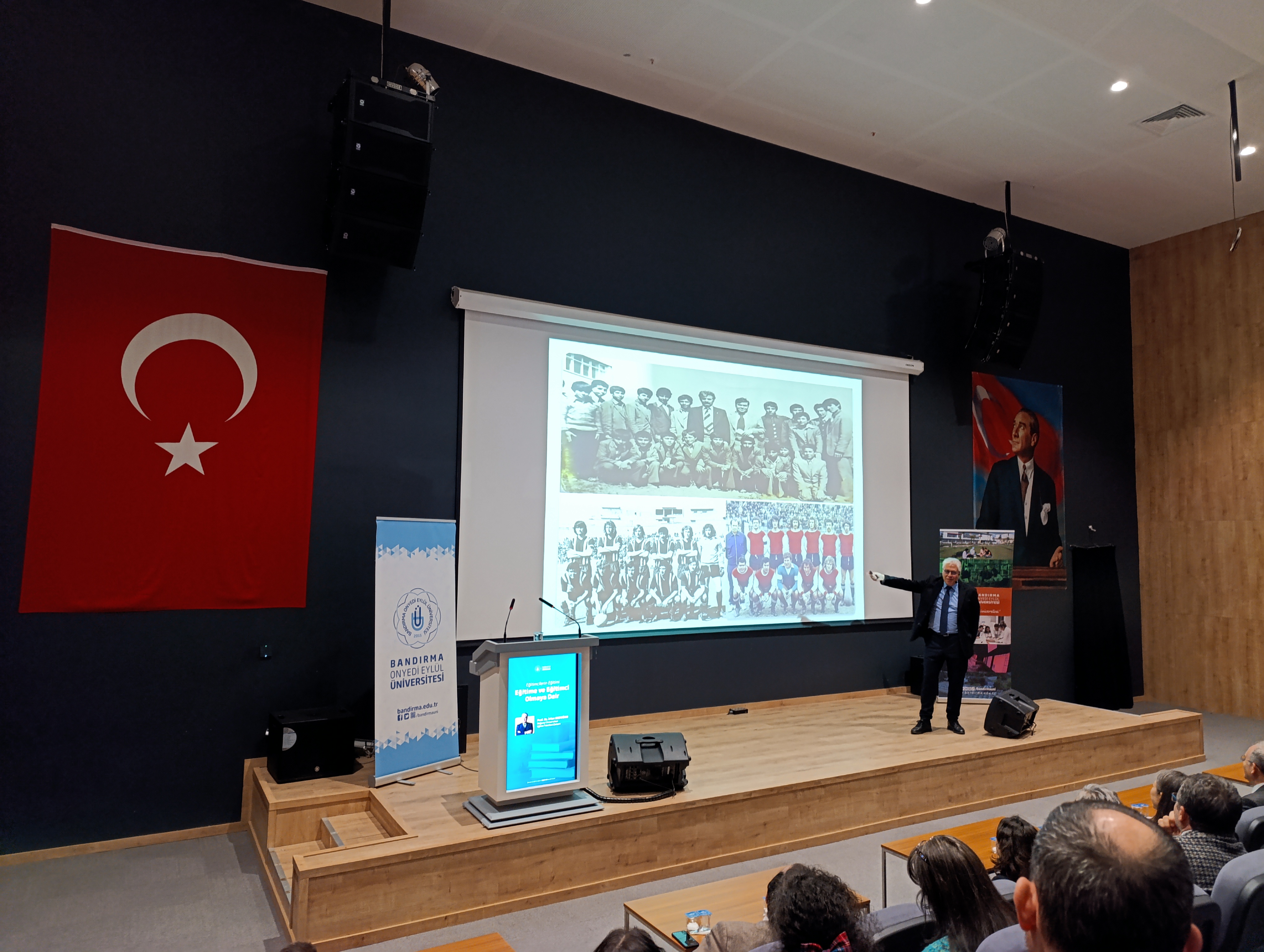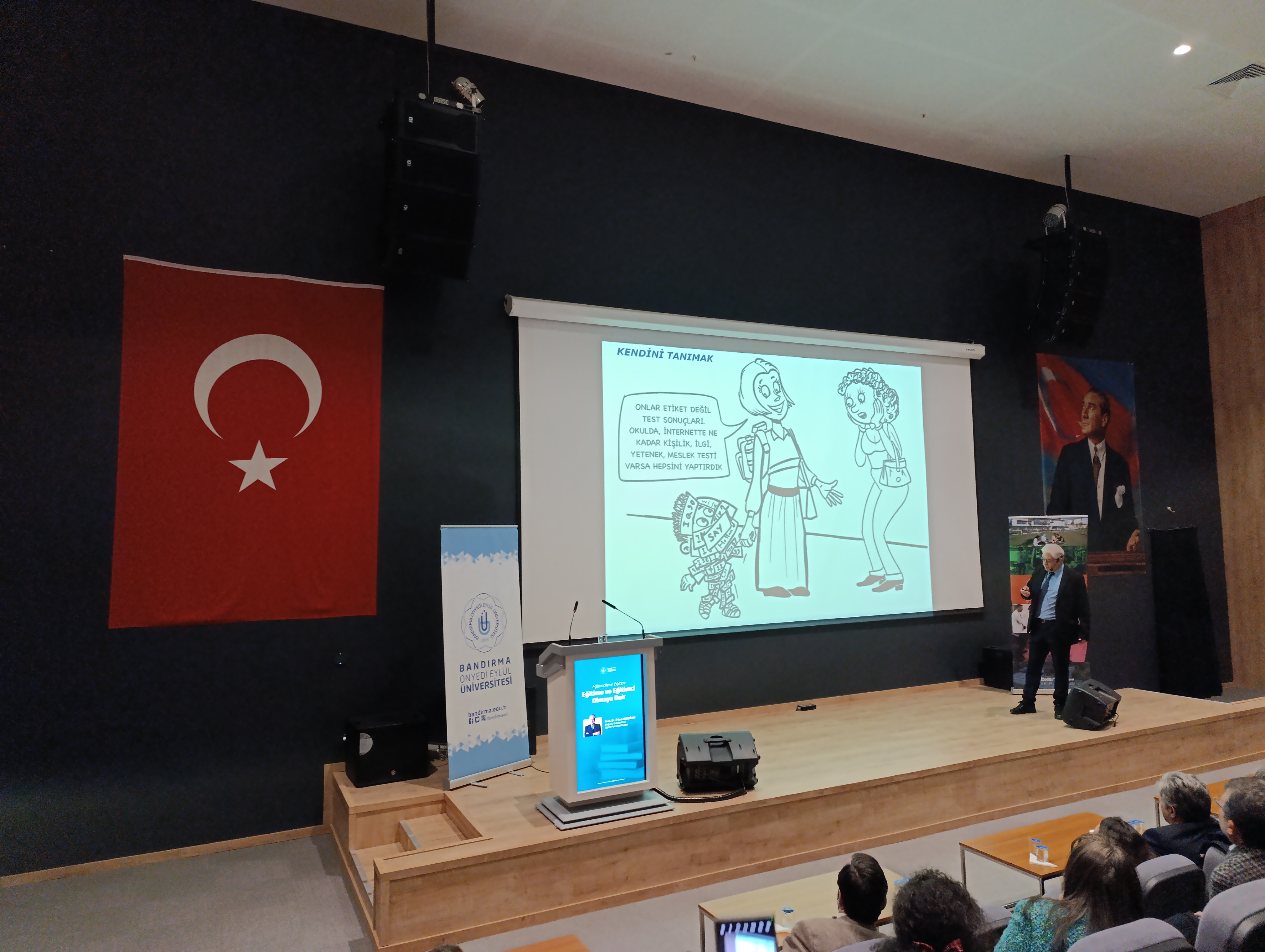 Eğitim hayatının bir bölümünü Bandırma Şehit Süleyman Bey Ortaokulu’nda geçiren Prof. Dr. İrfan Erdoğan, sözlerine Bandırma ile ilgili anılarını anlatarak başladı. Eğitim alanında yazılan eserlerden ve bu alanda çalışma yapan yazarların hayatlarından kesitler sunan Prof. Dr. İrfan Erdoğan, ebeveynlerin çocuklarına başarılı insanların biyografilerini okutmayı önermesini tavsiye etti. Kendi tecrübelerinden ve okuduklarından yola çıkarak yaptığı bir çıkarım sonucu “Öğrenci olmanın püf noktalarını çözen bireyler çok iyi bir öğretmen olabilir.” ifadelerini kullanan Prof. Dr. İrfan Erdoğan, “Öğretmen ilkokulda da üniversitede de filozof gibi davranış sergilemelidir. Filozofluk ise size ait bir şeydir; paket halinde verilen bir olgu değildir” ifadelerinin altını çizdi. Geçmişteki eğitim sistemini toptan övmenin ya da yermenin hata olacağını belirten Prof. Dr. İrfan Erdoğan, eğitim hayatının en önemli materyali olan kitapların müfredatın ötesinde icraat içermesi gerektiğini vurguladı.