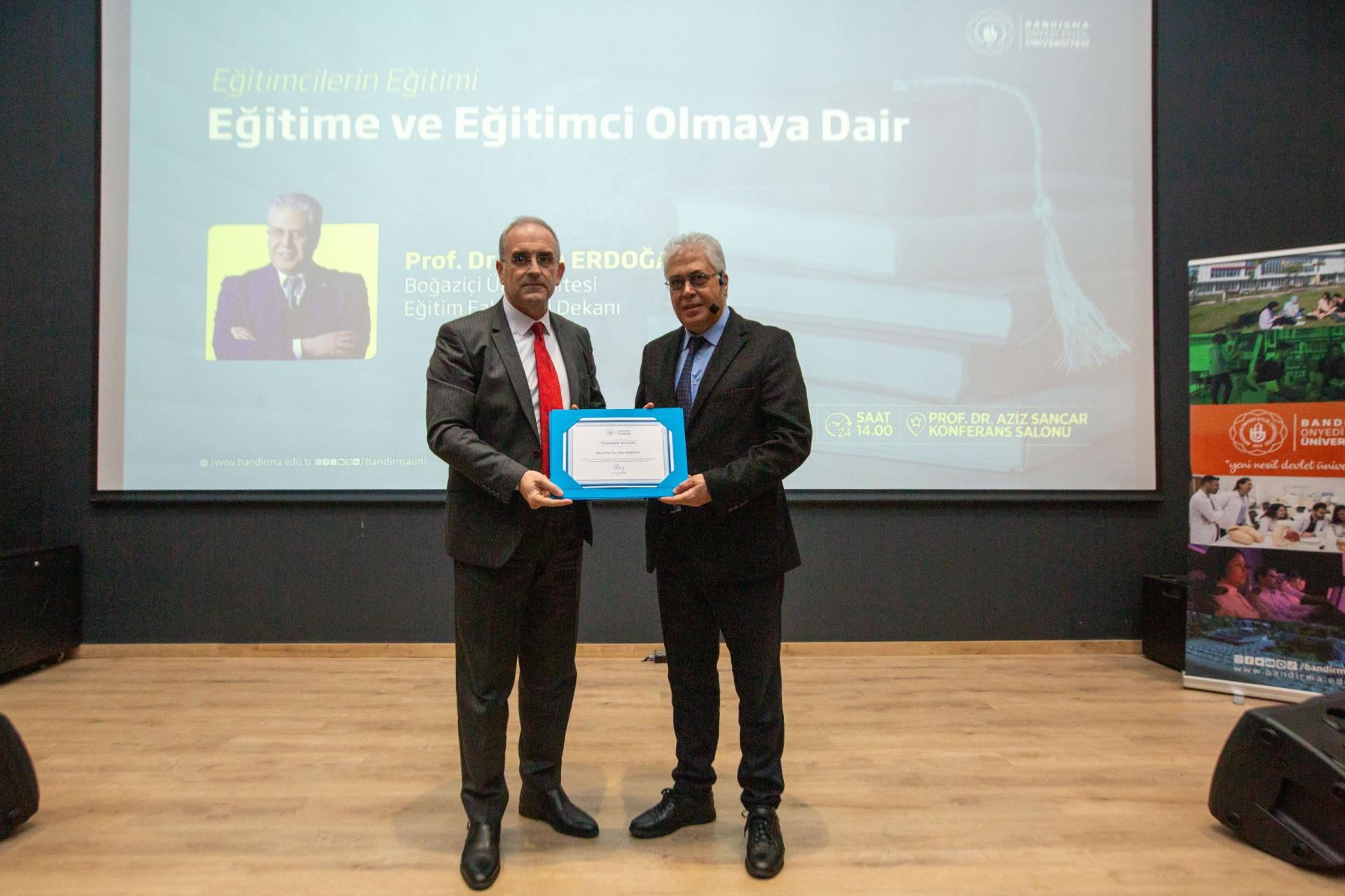Konferans sonunda BANÜ Rektörü Prof. Dr. İsmail Boz tarafından davetli konuşmacı Boğaziçi Üniversitesi Eğitim Fakültesi Dekanı Prof. Dr. İrfan Erdoğan’a teşekkür belgesi takdim edildi ve günün anısına hatıra fotoğrafı çekildi.