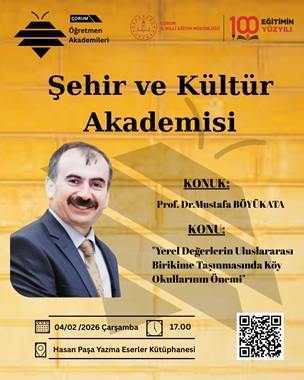 Çorum İl Millî Eğitim Müdürlüğünce “Öğretmen Akademileri” kapsamında düzenlenen “Şehir ve Kültür Akademisi” etkinliklerinin 4 Şubat 2026 Çarşamba akşamki program konuğu Yozgat Bozok Üniversitesi öğretim üyesi Prof. Dr. Mustafa Böyükata oldu.