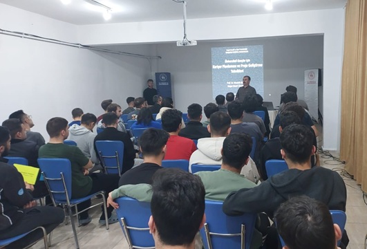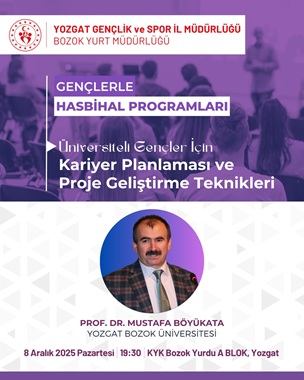 Yozgat Bozok Üniversitesi (YOBÜ) Öğretim Üyesi Prof. Dr. Mustafa Böyükata, 8 Aralık 2025 Pazartesi akşamı Yozgat KYK Bozok Erkek Yurdu Seminer salonunda yurtta kalan gençlerle bir araya geldi. “Üniversiteli Gençler için Kariyer Planlaması ve Proje Geliştirme Teknikleri" konulu sunumunda gençleri bilginin ve girişimciliğin önemine dair bilgiler verdi. Üniversitede geçen öğrencilik yıllarını proje tabanlı etkinliklerle ve araştırmalarla dolduran bireyler olmaları yönünde motive edici değerlendirmelerde bulundu.