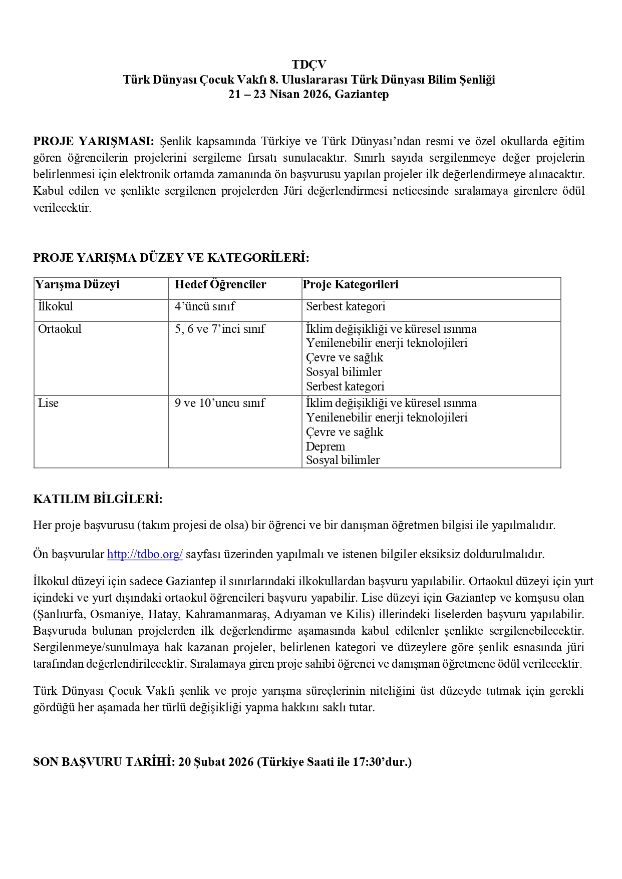 Bir fikri olan, bunu danışman öğretmeniyle birlikte projeye dönüştüren her çocuğumuz internet ortamında yarışmaya ücretsiz başvurabilir. Başvurular 20 Şubat 2026 gününe kadar yapılabilir.