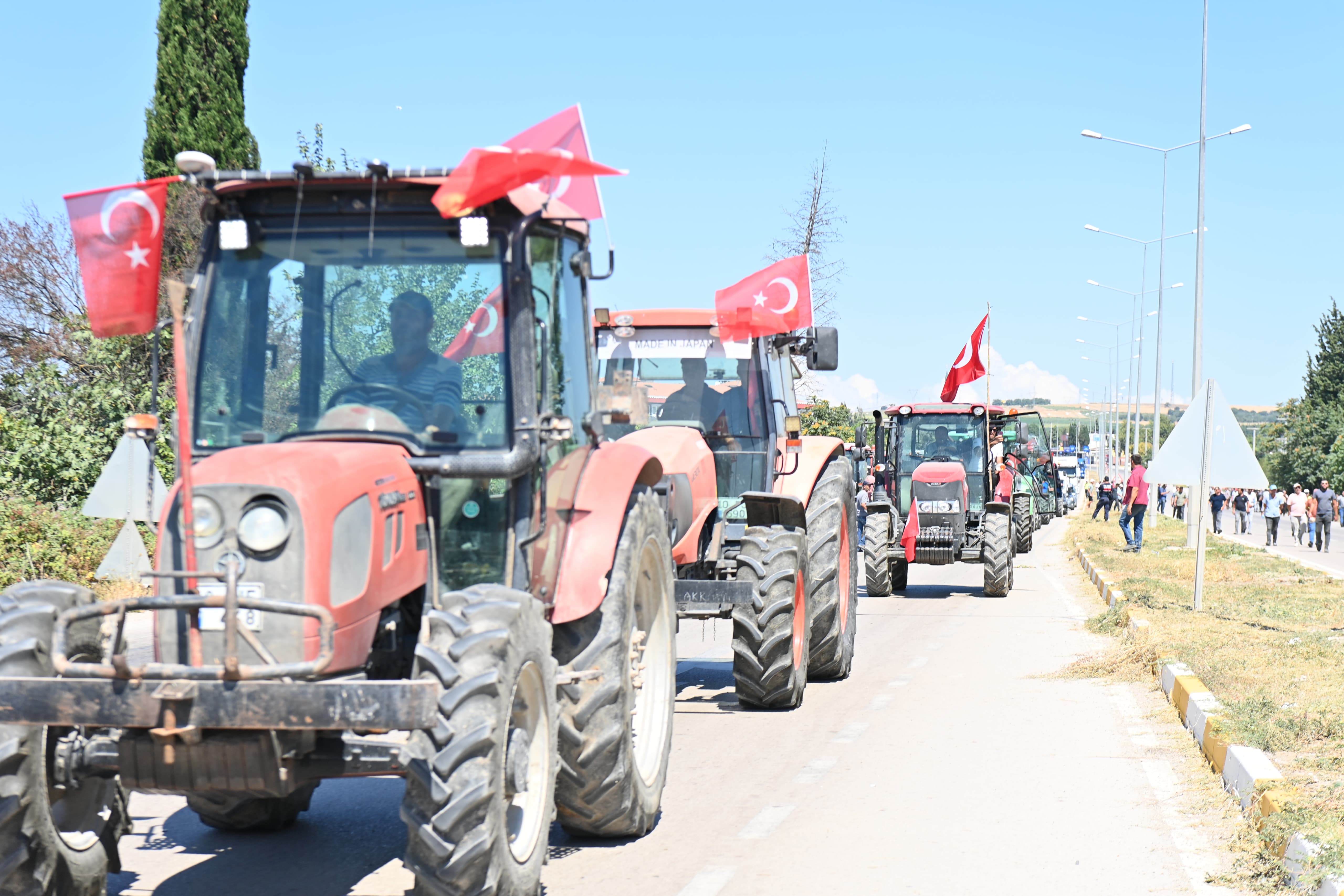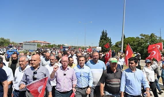 Zorlu ekonomik koşullar altında ezilen üreticilerin her zaman yanında dimdik duracaklarını söyleyen Başkan Ahmet Akın, üreticilerle kol kola Balıkesir-Bursa istikametinde temsili olarak Ankara’ya doğru yürüyerek yola çıktı. Çiftçiler eyleme ellerinde Türk Bayrakları, “Köylü Milletin Efendisidir”, “Domatesler Tarlada Kaldı” ibarelerinin bulunduğu dövizler eşliğinde traktörleriyle birlikte katıldı.