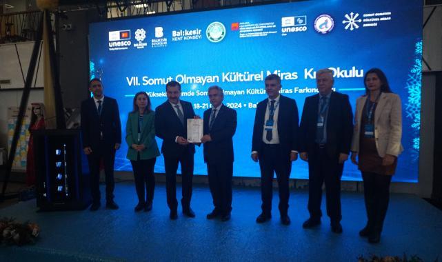 Prof.Dr. M.Öcal Oğuz’da, Yücel Yılmaz’a, Balıkesir'in "Öğrenen Şehirler" arasına kabul edildiğine dair UNESCO belgesini takdim etti.