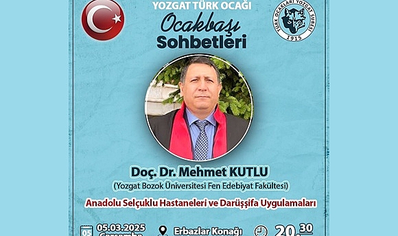 Erbazlar Konağı’nda 5 Mart 2025 Çarşamba akşamı Türk Ocakları Yozgat Şube Başkanı Dr. Öğretim Üyesi Gökalp Çınarer’in selamlama konuşmasıyla başlayan programda Doç. Dr. Mehmet Kutlu, “Anadolu Selçuklu Hastaneleri ve Darüşşifa Uygulamaları” başlıklı sunumunda özellikle orta Anadolu’dan örnekleri farklı yönleriyle ele aldı.