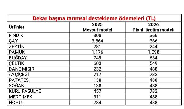 29 Ağustos 2024 tarihli Resmi Gazete’de ise 2025-2027 dönemini kapsayan 3 yıllık bitkisel üretim destekleri açıklandı. Yeni destekleme modelinde mazot ve gübre desteği 2025 üretim yılından itibariyle tamamen kaldırılıyor. Ayrıca fındıkta 11 yıldır dekar başına 170 lira olarak ödenen alan bazlı destek de kaldırıldı. Üretim planlaması kapsamındaki ürünlere ilave destek verilecek. Yeni destekleme modelinde dekar başına destek ödemesi yapılacak; 2025 yılı için dekar başına 244 liralık bir katsayı belirlendi. Temel destek ve planlı üretim gibi destekler bu katsayı ile çarpılarak ödenecek.