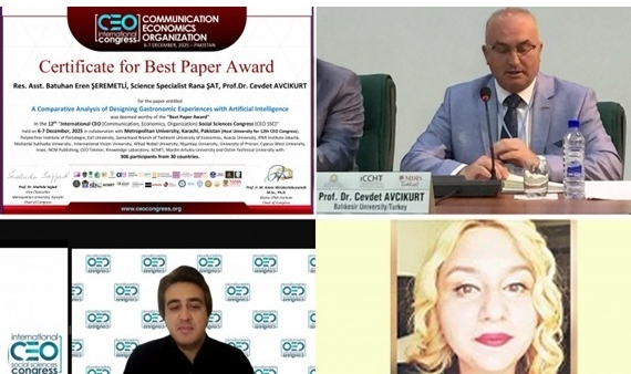 Balıkesir Üniversitesi öğrencisi ve Adıyaman Üniversitesi Turizm Fakültesi Turizm Rehberliği Bölümü akademisyeni Arş. Gör. Batuhan Eren Şeremetli, Balıkesir Üniversitesi öğrencisi Bilim Uzmanı Rana Şat ve Turizm Fakültesi Turizm İşletmeciliği Bölümü akademisyenlerinden, Rektör Yardımcısı Prof. Dr. Cevdet Avcıkurt, tarafından sunulan “A Comparative Analysis of Designing Gastronomic Experiences With Artificial Intelligence” başlıklı bildiri, 6-7 Aralık 2025 tarihleri arasında Pakistan’ın Karachi kentinde Metropolitan University ev sahipliğinde düzenlenen ve 30 ülkeden 306 bildirinin yer aldığı 12th International CEO Social Sciences Congress’te “Best Paper Award / En İyi Bildiri” ödülü ile ödüllendirildi.